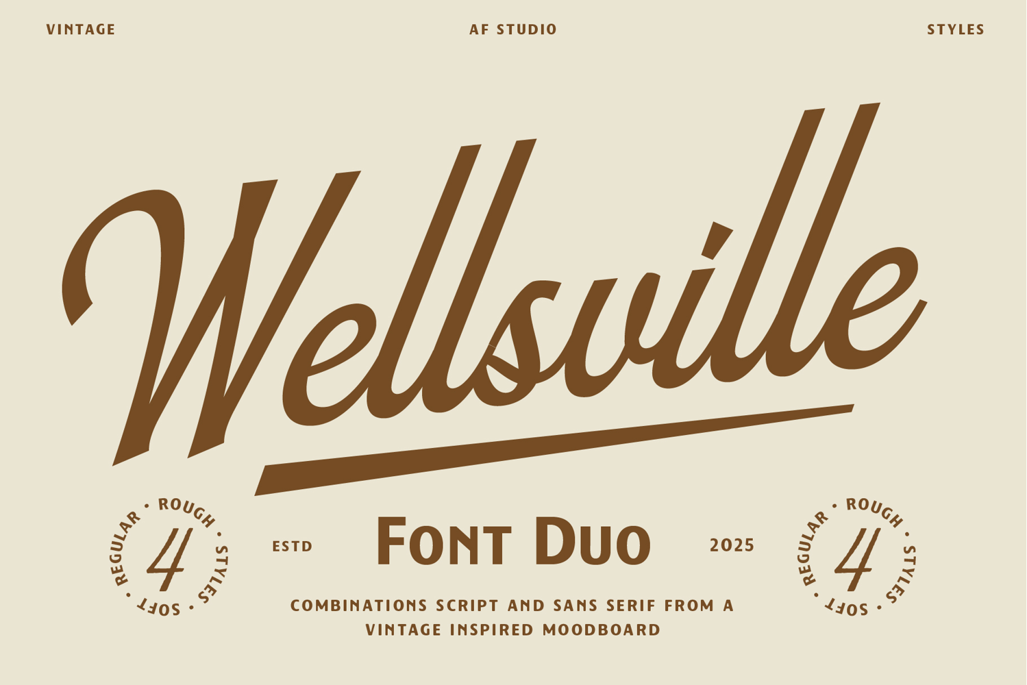Wellsville is a vintage-inspired font duo that artfully combines a smooth script with a bold sans serif, making it ideal for timeless design projects. This font is perfect for creating distinctive logos, elegant packaging, charming cafe branding, or nostalgic posters.