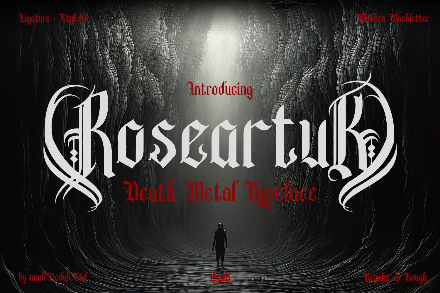 Introducing Roseartuk, a Metal Blackletter style featuring bold, sharp, and decorative letterforms that evoke a classic gothic feel. This font comes with various styles, combining ligatures and special alternative glyphs, allowing for endless creative layouts and compositions. Perfectly crafted for logos and a range of formal applications, it shines in invitations, labels, magazines, book covers, greeting cards, packaging, makeup, novels, metal music posters, and vintage-themed designs. Whether you're creating digital content or printed materials, this font conveys a strong historic character, making it an ideal choice for impactful branding.