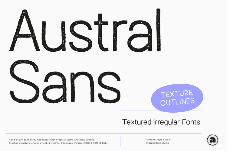 Austral Sans is a hand-drawn layered type family. It is casual, robust, and spirited. It is monolinear in spirit, despite having irregular stems that give the fonts an eroded effect (particularly exaggerated in the Medium styles). It was originally released in 2016, and in 2024 updated with version 2.000 that includes a new weight distribution and clean no-textured fonts, major updates on glyph support, OpenType features, corrections on the design of specific characters, and more. The Textured styles come in three weights, Thin, Light, and Medium, which all share the same crooked structure with bent strokes and irregular outlines.