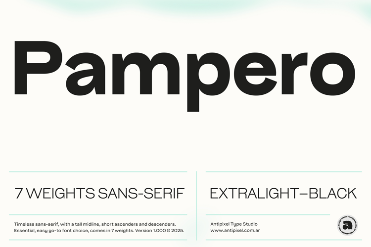 Pampero consists of 7 font weights ranging from ExtraLight to Black: ExtraLight, Light, Regular, Medium, Bold, ExtraBold, and Black, making it an essential typeface for any design workflow.