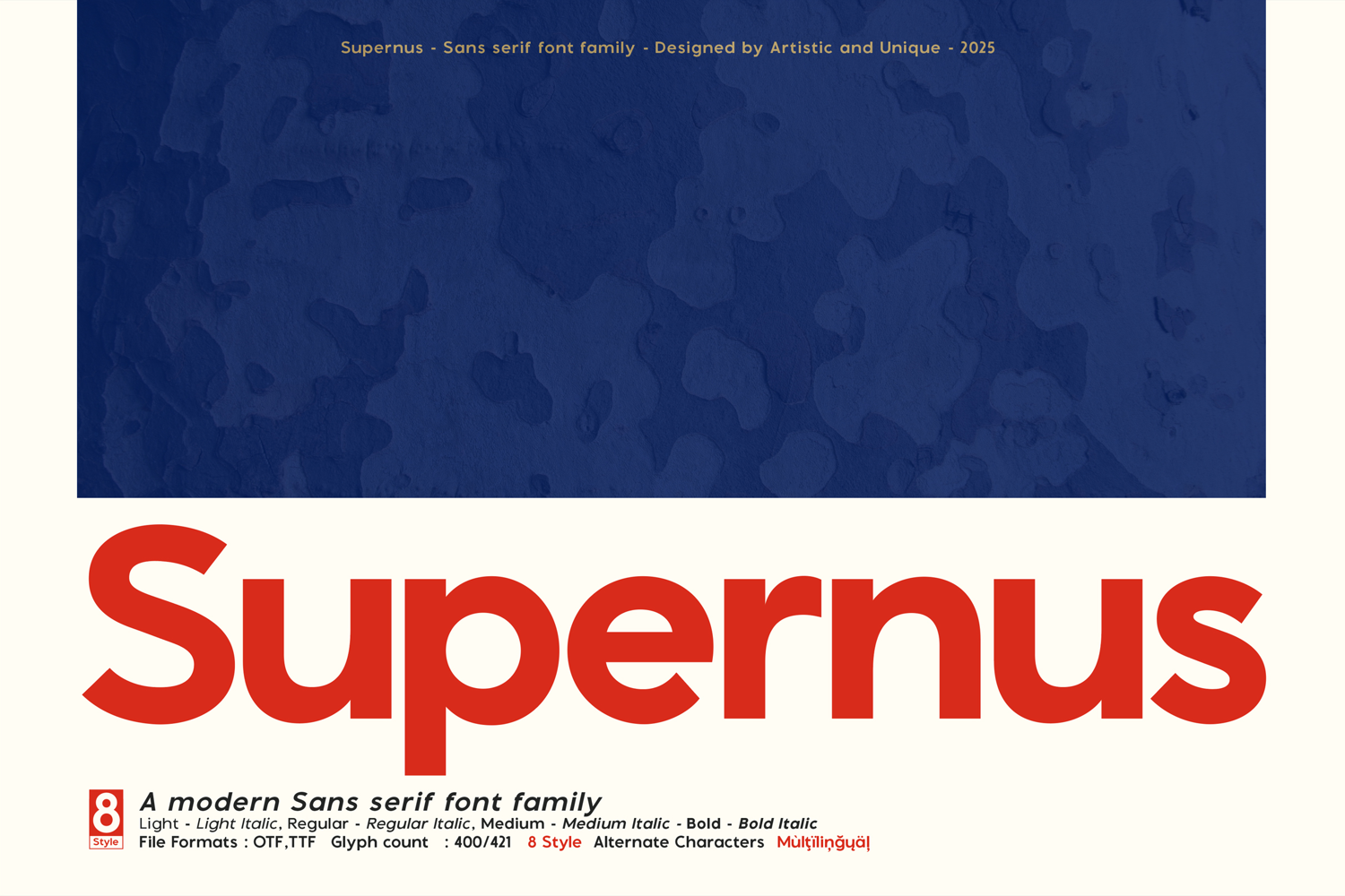 Supernus - Sans serif Font Family - 8 Styles - Multilingual Support.