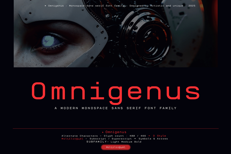 Omnigenus - A functional and contemporary font designed for technology-focused applications, offering a futuristic approach to modern, monospaced fonts. Inspired by the visual, mechanical, and industrial heritage of the tech world, Omnigenus not only boasts visual appeal but also the high readability that distinguishes monospaced fonts.