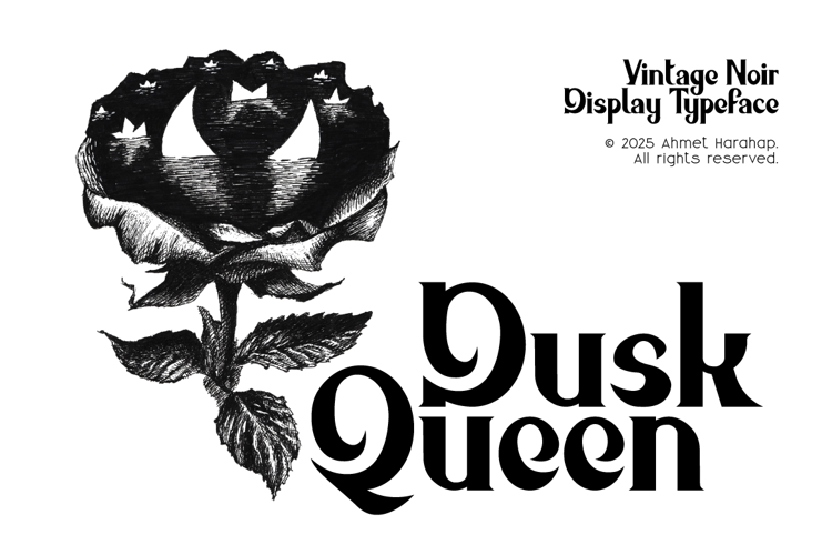 Dusk Queen is ideal for posters, album artwork, branding, editorial headlines, packaging, and logo design where a classic and expressive display typeface is needed.
