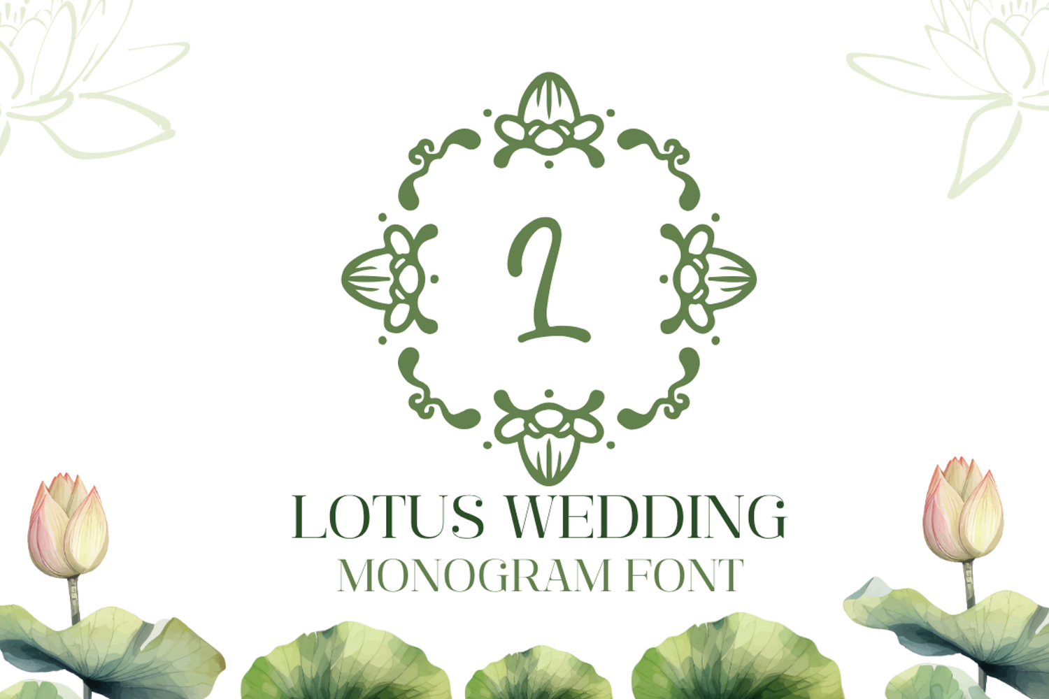 Lotus Wedding Monogram Font is a refined monogram typeface inspired by lotus motifs and botanical scrolls. It includes uppercase, lowercase, and numerals, plus coordinated monogram frames that surround a single initial for instant.