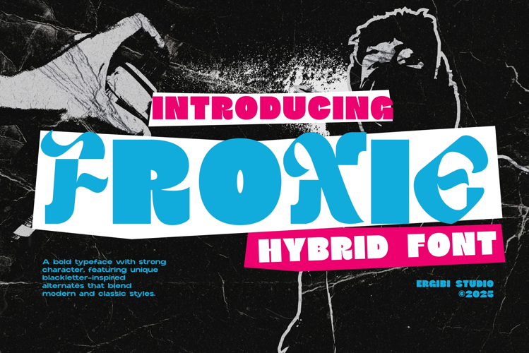 Its sans-inspired structure ensures legibility, while the blackletter details add personality and expressive depth. This balance makes Froxie a versatile choice for branding, editorial design, fashion logos, and street-style-inspired visuals.