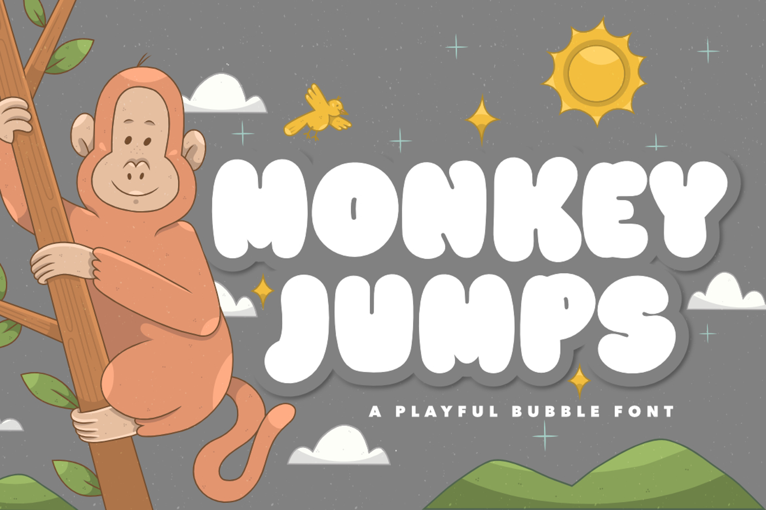Monkey Jumps a Playful Bubble Display Font brings cheerful energy and joyful personality to every design. Inspired by children’s illustrations and friendly cartoon lettering, this font features chunky rounded letterforms, soft curves, and a bouncy visual rhythm that feels fun, warm, and approachable.