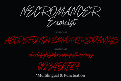 "Necromancer Exorcist" is a handwritten cipher, sparked with wild brushes and untamed energy. Drenched in asserts of red, it exudes a frantic, frenzied aura - a memento of an ill-fated ritual gone awry. This font amplifies drama, rebellion, and intensity, making it ideal for song titles, tour posters, and expressive overlays that shriek a rebel yell.