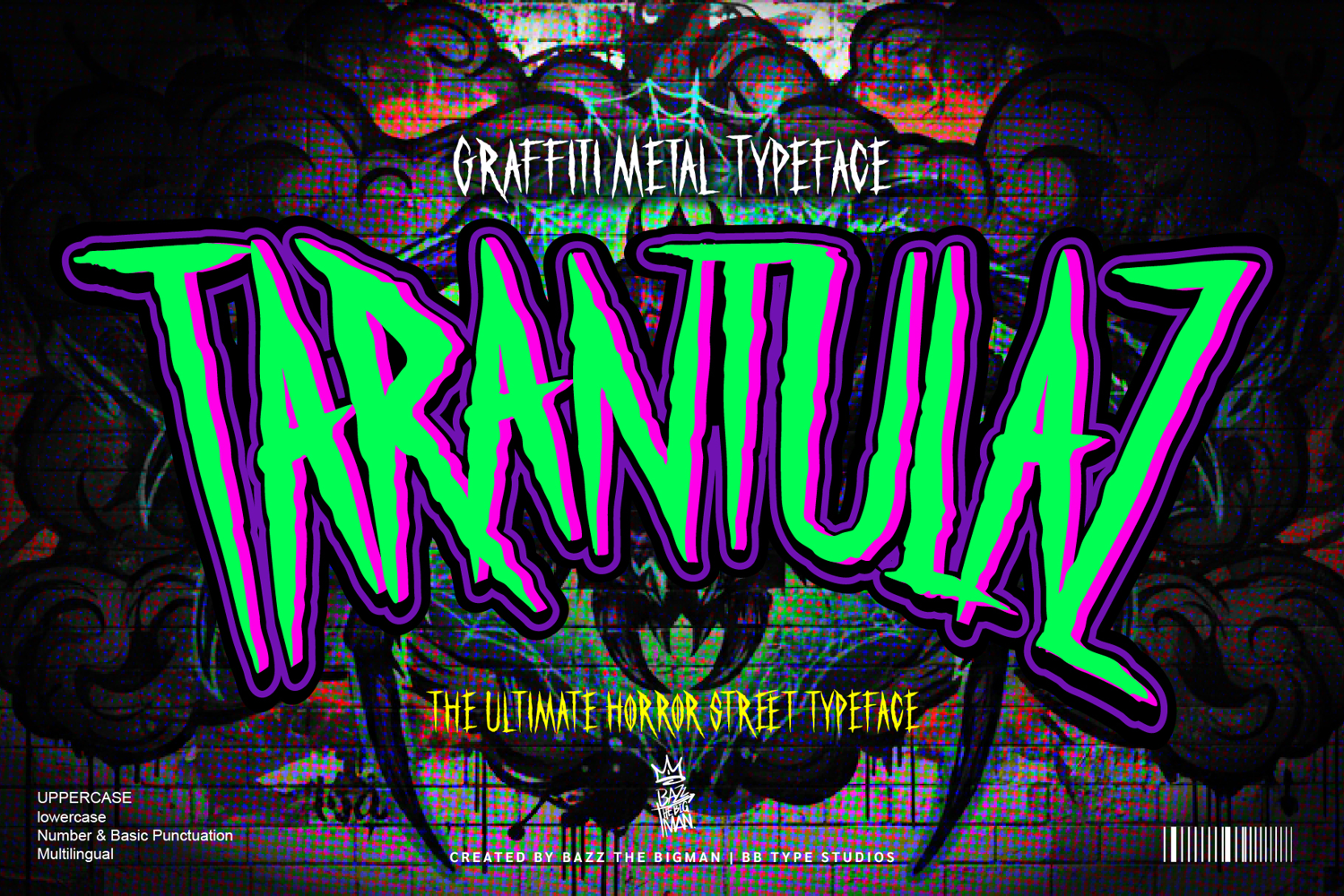 Are you ready to inject raw, aggressive energy into your design projects? TARANTULAZ is a high-impact Display Typeface forged in the darkness of the urban jungle, perfect for crushing the competition with its intimidating, razor-sharp style. Inspired by Metal Album Covers, Gritty Street Art, and Classic Horror Films, TARANTULAZ is not just a font—it’s an auditory assault translated into type.