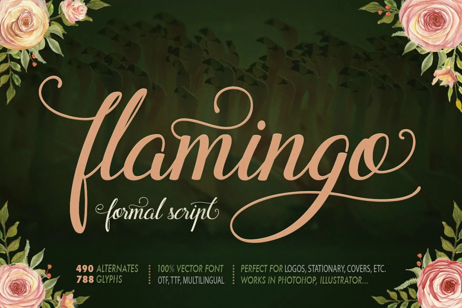 Flamingo is handwritten modern script calligraphy font with numerous alternates. Now it is opentype! It is smart and it is working in Photoshop*! You are welcome to use it for various purposes: logo, wedding invitation, headings, signatures, t-shirt, letterhead, signage, labels, posters etc.