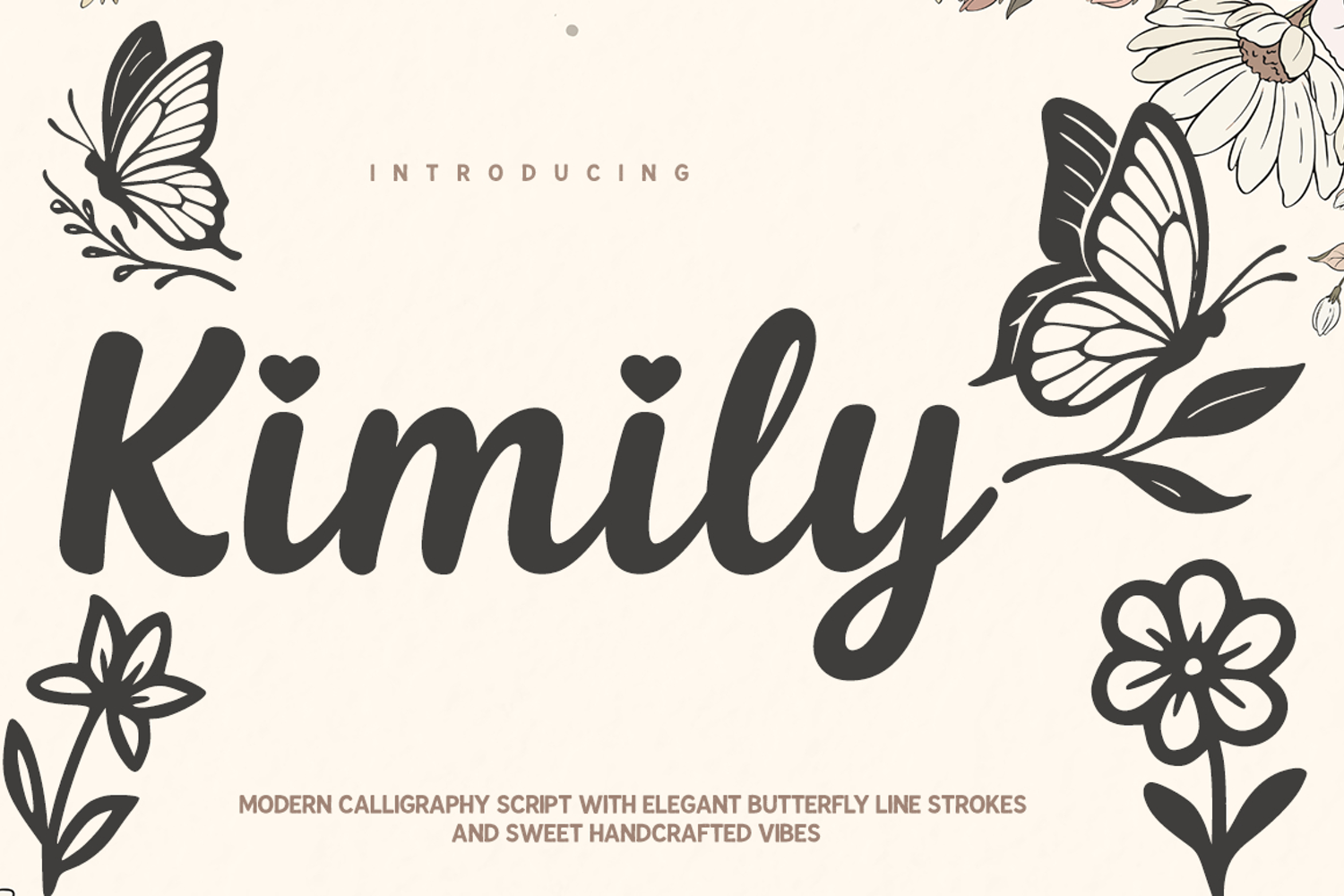 Kimily is a modern calligraphy script featuring smooth strokes and elegant handcrafted curves. The letterforms present balanced contrast, clean readability, and a soft feminine tone. Subtle heart accents on selected characters add a sweet visual touch.