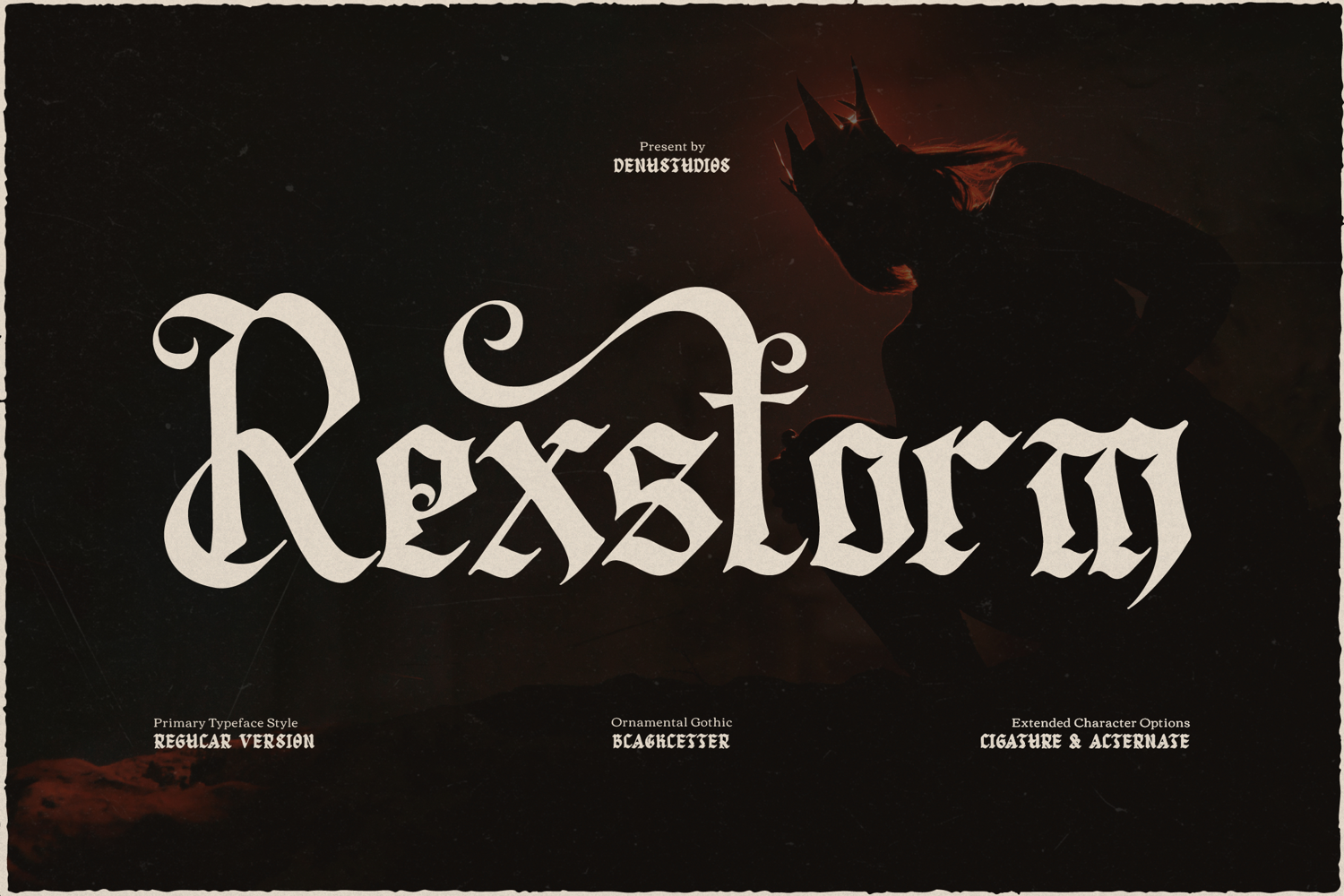 Rexstorm | Blackletter Typeface, from Denustudios, suitable for any projects such as: logos, branding projects, homeware designs, product packaging, mugs, quotes, posters, shopping bags, t-shirts, book covers, name card, invitation cards, greeting cards, label, photography, watermark, special events, and all your other lovely projects that need a Blackletter taste.