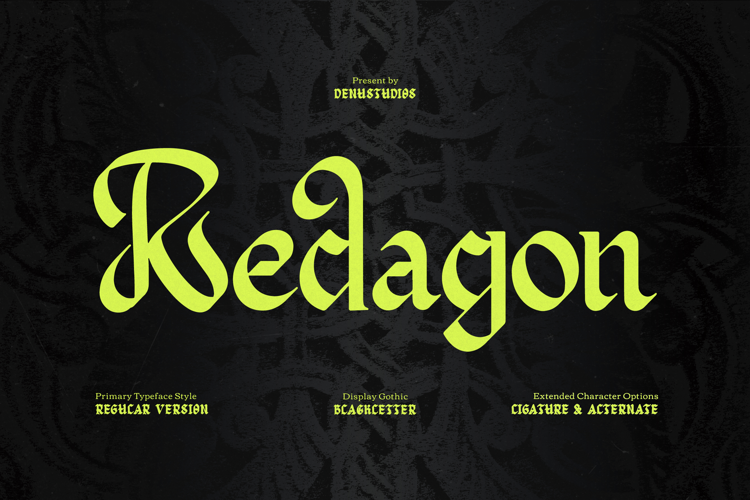Redagon | Blackletter Typeface, from Denustudios, suitable for any projects such as: logos, branding projects, homeware designs, product packaging, mugs, quotes, posters, shopping bags, t-shirts, book covers, name card, invitation cards, greeting cards, label, photography, watermark, special events, and all your other lovely projects that need a Blackletter taste.