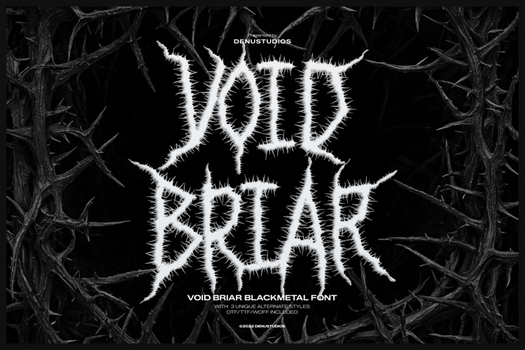 Void Briar | Black Metal Font, from Denustudios, suitable for any projects such as: logos, branding projects, homeware designs, product packaging, mugs, quotes, posters, shopping bags, t-shirts, book covers, name card, invitation cards, greeting cards, label, photography, watermark, special events, and all your other lovely projects that need a Black Metal taste.