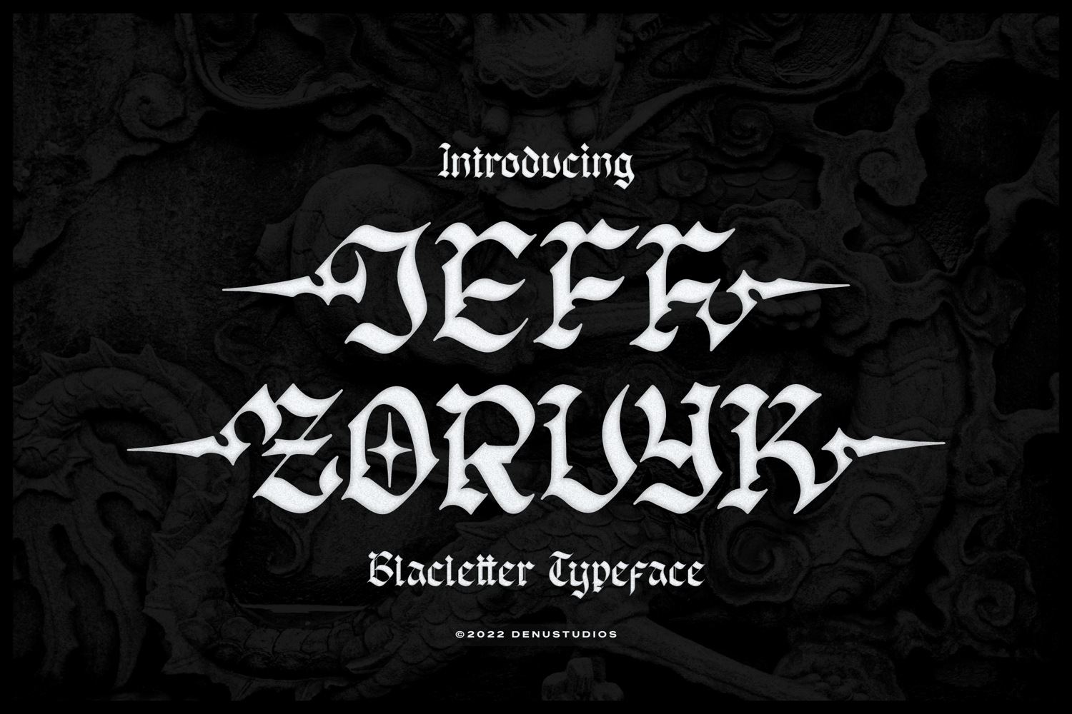 Jeff Zorvyk | Blackletter Typeface, from Denustudios, suitable for any projects such as: logos, branding projects, homeware designs, product packaging, mugs, quotes, posters, shopping bags, t-shirts, book covers, name card, invitation cards, greeting cards, label, photography, watermark, special events, and all your other lovely projects that need a Blackletter taste.