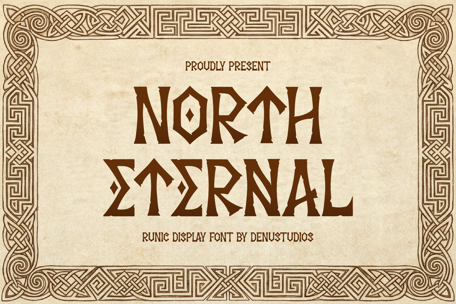 North Eternal | Runic Display Font, from Denustudios, suitable for any projects such as: logos, branding projects, homeware designs, product packaging, mugs, quotes, posters, shopping bags, t-shirts, book covers, name card, invitation cards, greeting cards, label, photography, watermark, special events, and all your other lovely projects that need a Runic taste.