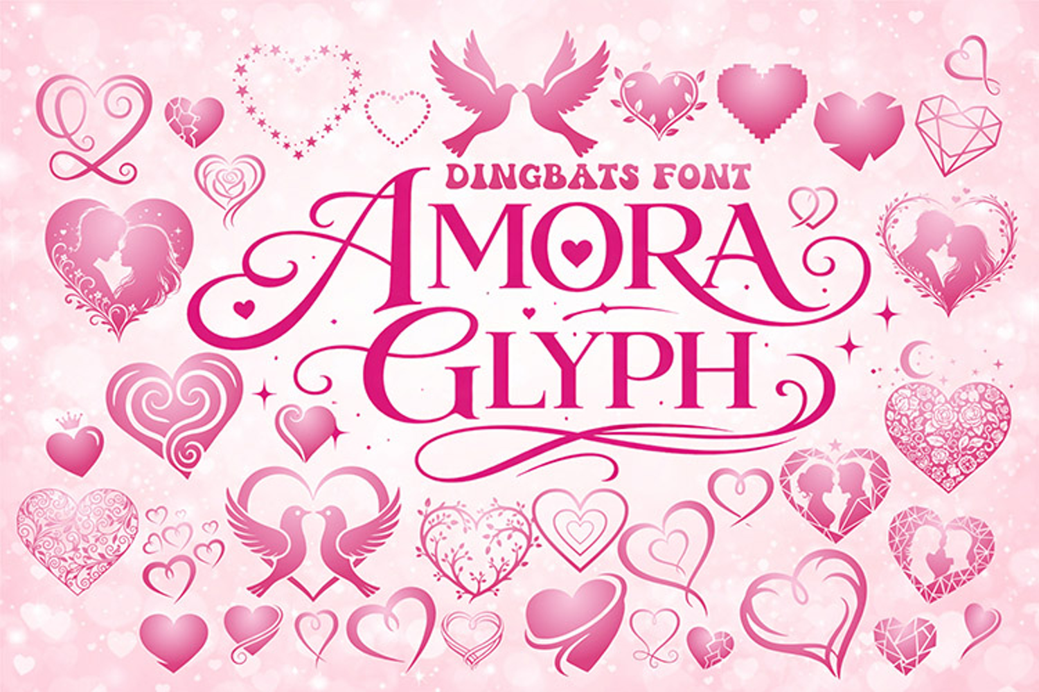 Whether you are designing for weddings, love-themed events, greeting cards, or luxury romantic branding, the AmoraGlyph dingbats font brings warmth, elegance, and intimacy to every composition.
