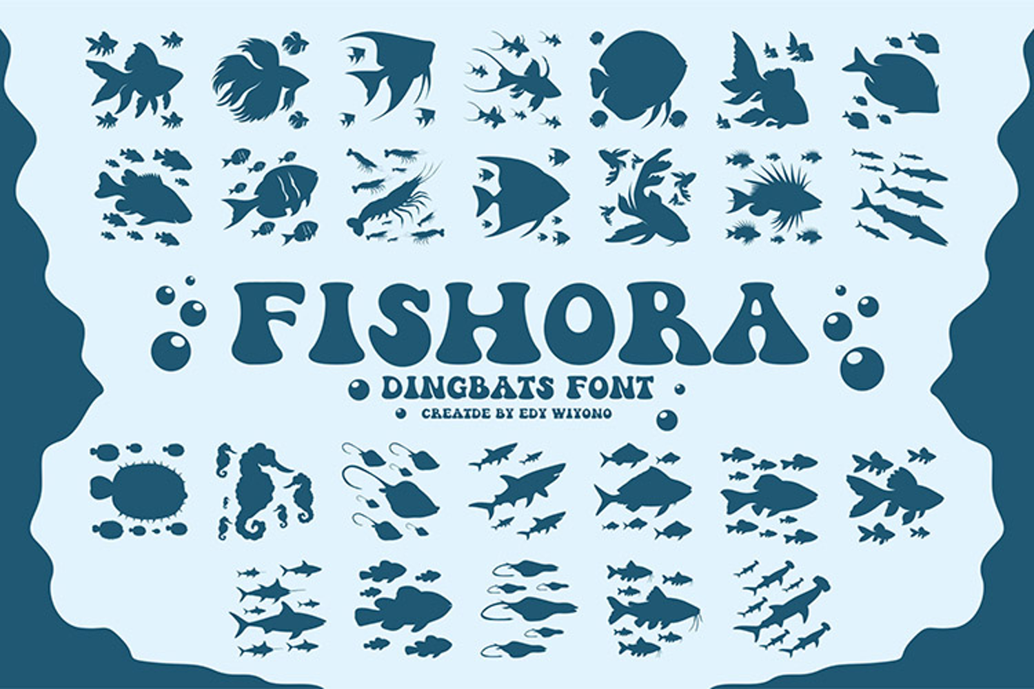 Fishora font is inspired by the beauty and diversity of the underwater world, reflecting the character of sea fish, freshwater fish, and shrimp. Its letterforms feel organic, fluid, and dynamic, resembling the movement of fins, flowing water, and the natural textures of aquatic life.