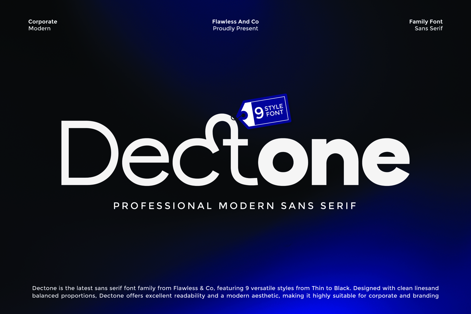 Dectone is a modern sans serif family font crafted for professionals who value clarity, versatility, and clean design. Featuring 9 distinctive styles ranging from Thin to Black, Dectone offers designers the flexibility to create dynamic hierarchies and striking compositions across various media. With its balanced proportions, sharp geometry, and smooth readability, Dectone is built to excel in both print and digital platforms. From corporate branding to editorial layouts, from digital interfaces to product packaging, this font family adapts seamlessly to every project.