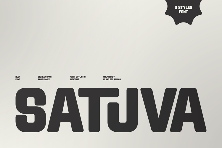 Satuva is a bold and modern display sans serif font family designed to make a statement. Featuring smooth rounded edges and strong geometric shapes, this font blends a contemporary aesthetic with high readability, making it perfect for impactful branding and design projects. With 9 versatile styles, Satuva offers flexibility for both digital and print applications — from bold headlines and attention-grabbing logos to sleek packaging and editorial layouts. Its unique ligature set adds personality and flow to your typography, helping your design stand out with confidence and modern charm.