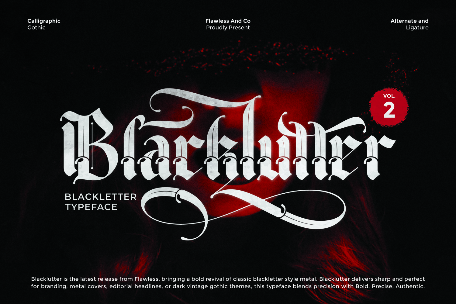 Blacklutter Vol2 is a bold and powerful blackletter typeface that combines traditional gothic style with a modern touch. Its sharp edges, dramatic strokes, and distinctive letterforms make it perfect for designs that demand strength, authority, and style. This typeface is ideal for branding, logos, posters, merchandise, album covers, tattoo lettering, and more. Whether you’re working on a vintage-inspired project or aiming for an edgy, contemporary look, Blacklutter will make your typography stand out.