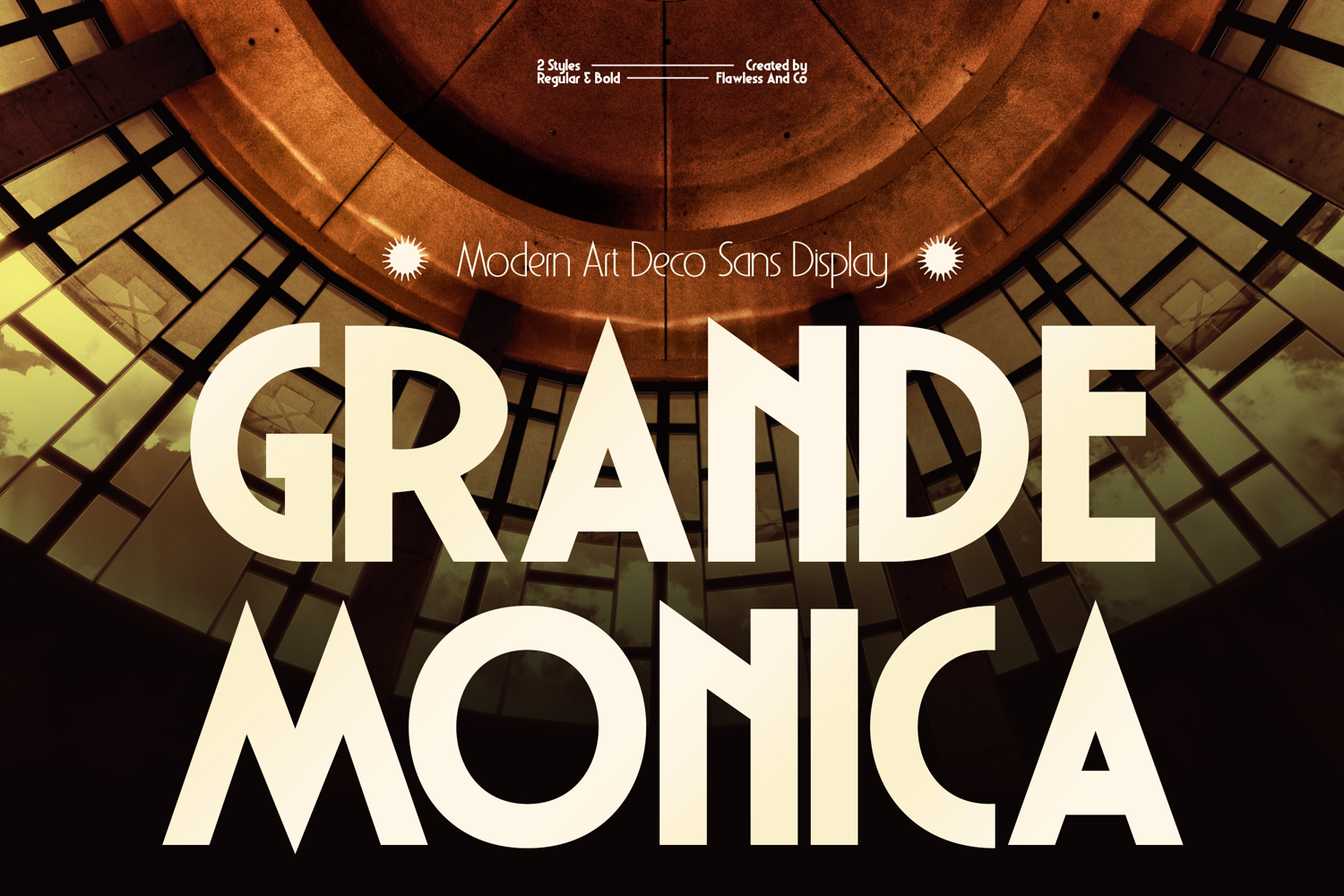 Grande Monica is a refined display sans serif font that blends modern Art Deco aesthetics with timeless vintage luxury. Featuring 2 versatile styles (Regular & Bold), this font is crafted to deliver strong visual impact while maintaining elegance and clarity. Its tall proportions, clean geometry, and distinctive letterforms make Grande Monica ideal for designs that demand sophistication, character, and confidence.