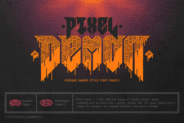 Hi! Pixel Demon — a font with raw energy of classic shooter games, combining pixel precision with a gritty, vintage vibe. Its heavy, game-inspired shapes are designed to command attention and spark nostalgia. A perfect weapon of choice for retro posters, gaming graphics, and bold digital art.