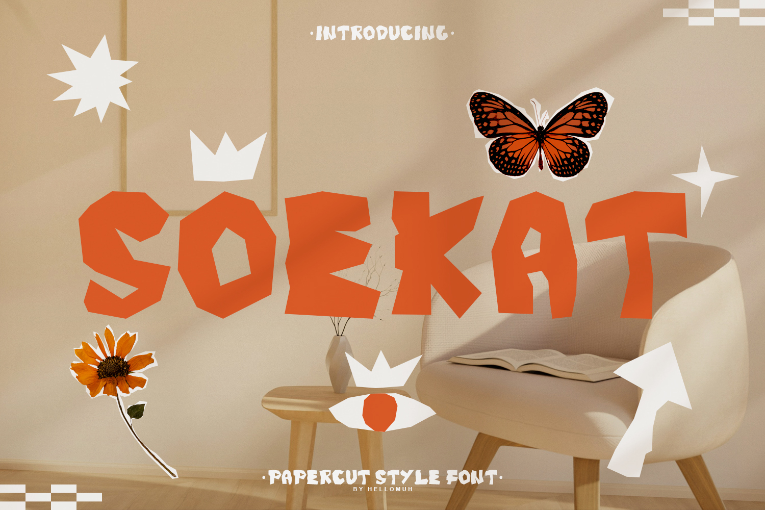 SOEKAT is a unique papercut-style display font with an expressive and artistic look. Each letter appears like a hand-cut shape, featuring irregular edges and sharp angles that create a playful, handmade aesthetic.