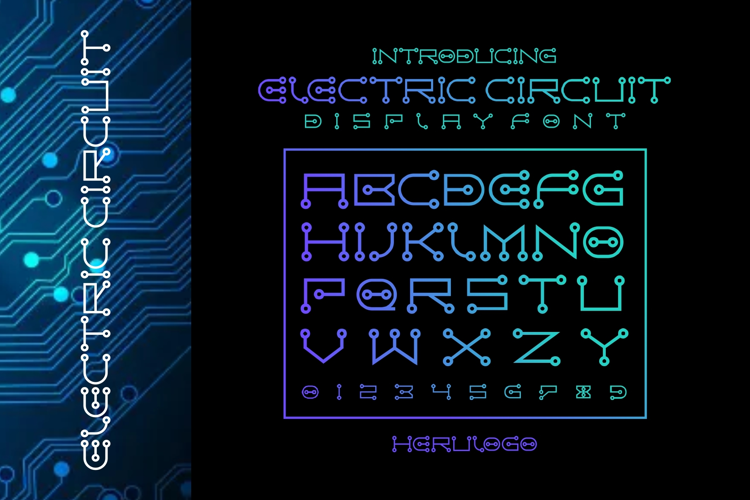The Electric Circuit font has a very distinct "high-tech" energy. This font is a futuristic display font inspired by the intricate pathways of a printed circuit board (PCB). It features a unique, monolinear design where every letterform is constructed using geometric lines and terminal nodes (small circles), mimicking electrical connections.