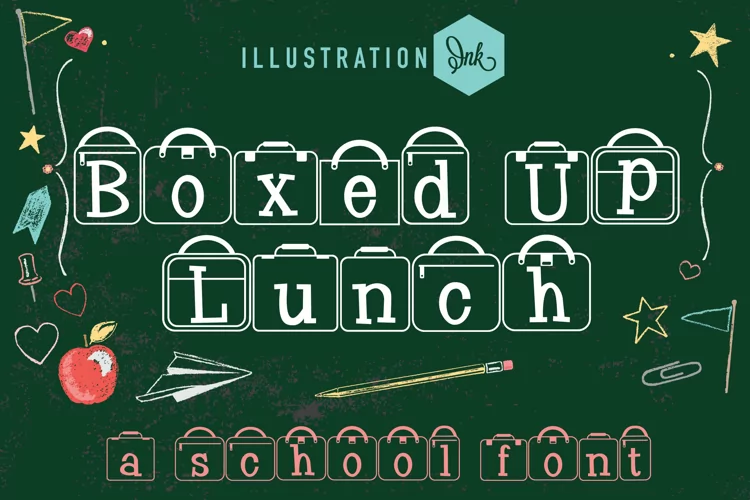 This hand-crafted serif font is displayed on a variety of lunch boxes.