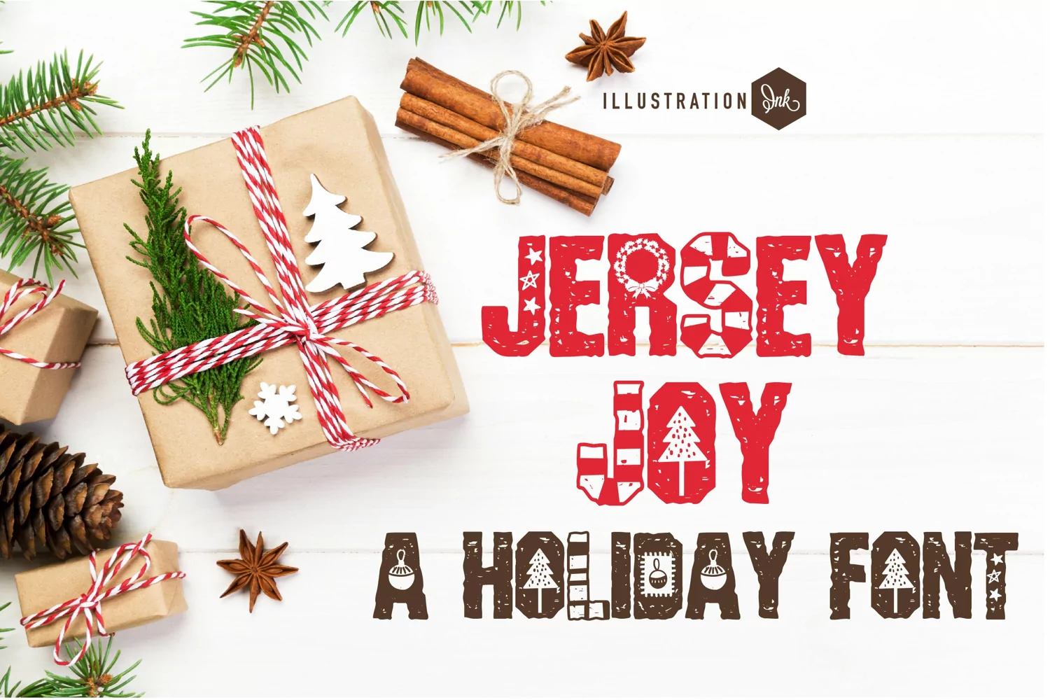 This athletic font has been spruced up for Christmas with candy cane stripes, ornaments and more.