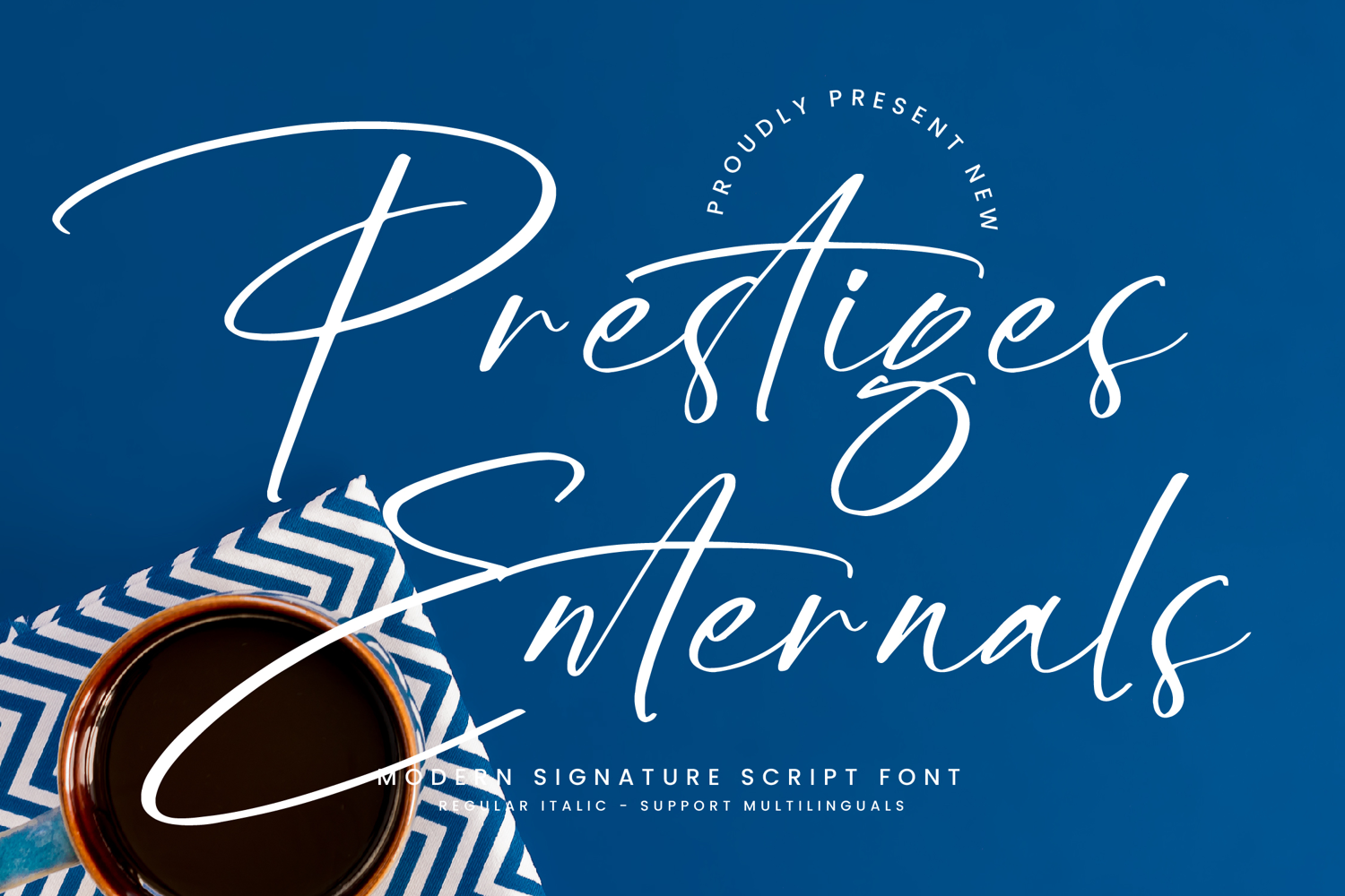 Prestiges Enternals - Modern Signature Script Font, from Integritype Studio, perfect for any project like: logos, branding projects, homewares designs, product packaging, mugs, quotes, posters, shopping bags, t-shirts, covers books, business cards, invitation cards, greeting cards, labels, photography, watermarks, special events and all your other luxury projects that require a premium taste.