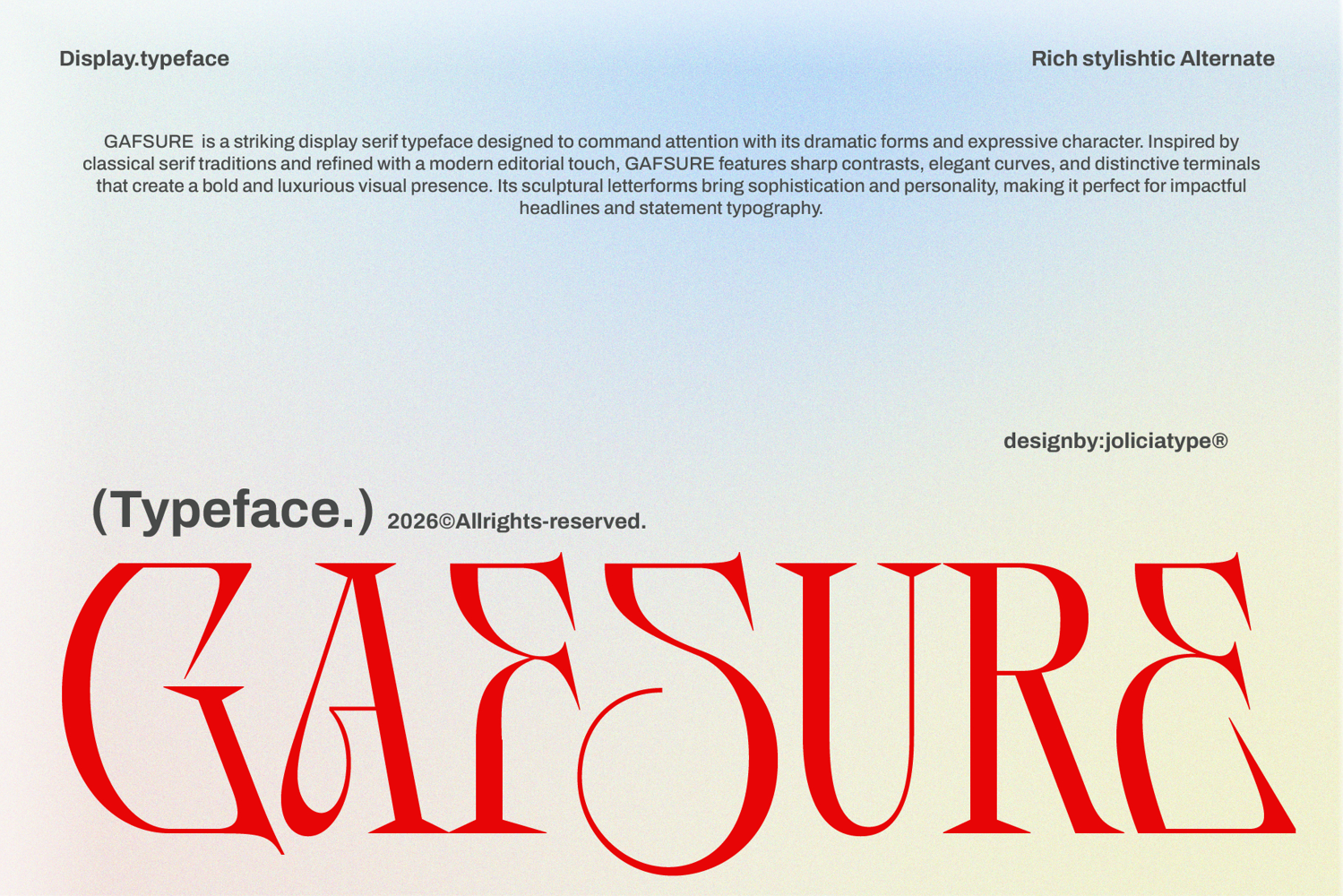 GAFSURE is a striking display serif typeface designed to command attention with its dramatic forms and expressive character. Inspired by classical serif traditions and refined with a modern editorial touch, GAFSURE features sharp contrasts, elegant curves, and distinctive terminals that create a bold and luxurious visual presence. Its sculptural letterforms bring sophistication and personality, making it perfect for impactful headlines and statement typography.