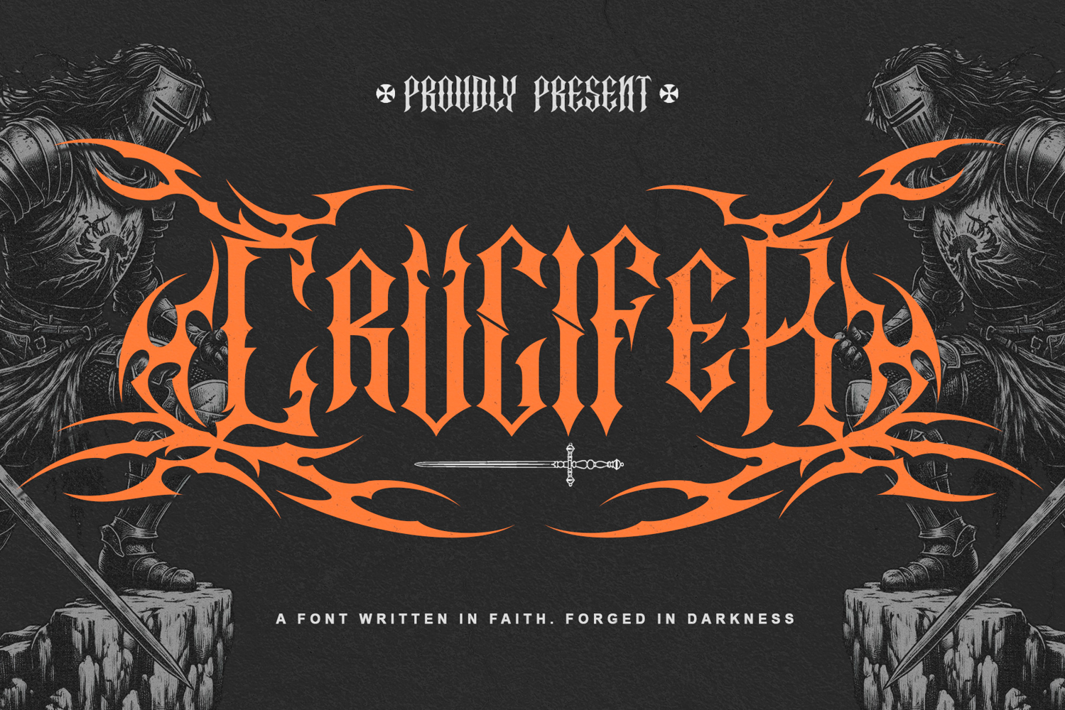 Descend into sacred darkness with Crucifer, a gothic blackletter font forged at the intersection of faith and shadow. With razor-sharp strokes, towering letterforms, and an atmosphere drawn from ancient cathedrals and forbidden manuscripts, Crucifer delivers a powerful, ritual-driven presence that feels carved in iron rather than written in ink. Designed for album covers, band logos, dark fantasy titles, tattoo designs, and cinematic visuals, this font commands attention with unapologetic intensity and solemn authority. Let Crucifer transform your typography into a symbol of dark devotion, where every letter stands in faith, and every word is forged in darkness.