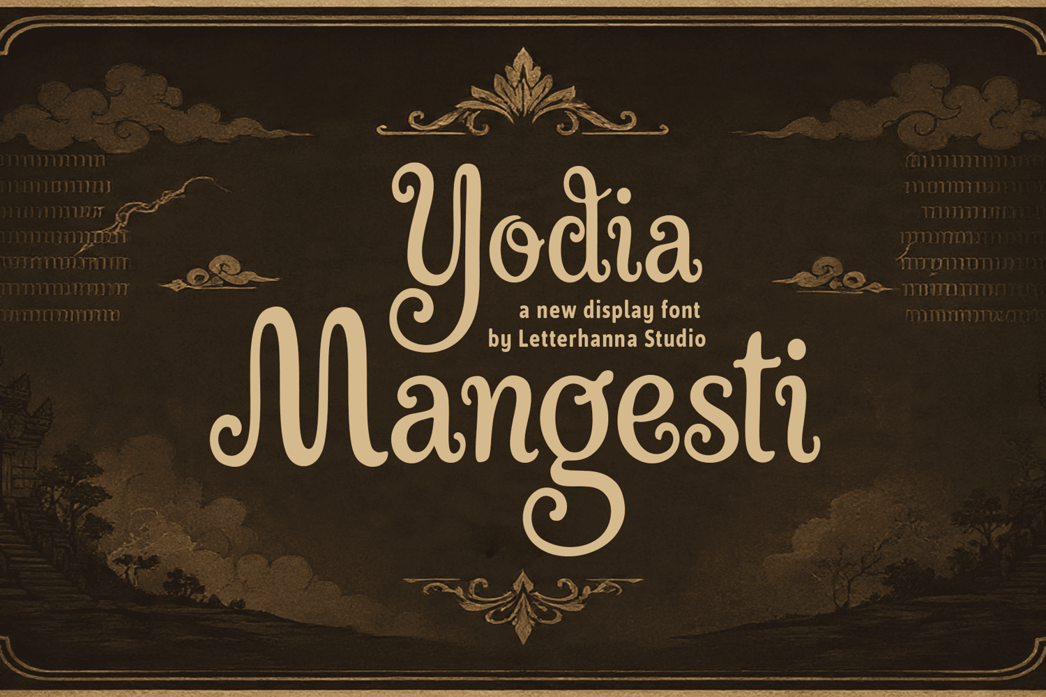 Introducing Yodia Mangesti — a bold, ornate display font inspired by the flowing curves and graceful strokes of Javanese script (Aksara Jawa), one of Southeast Asia's most revered traditional writing systems.