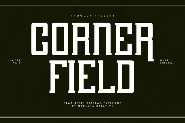 Corner Field slab serif display font. Heavy stroke, fun character with a bit of ligatures. To give you an extra creative work. Corner Field slab serif display font support multilingual more than 100+ language. This font is good for logo design, Social media, Movie Titles, Books Titles, a short text even a long text letter and good for your secondary text font with script or serif. Make a stunning work with Corner Field slab serif display font.