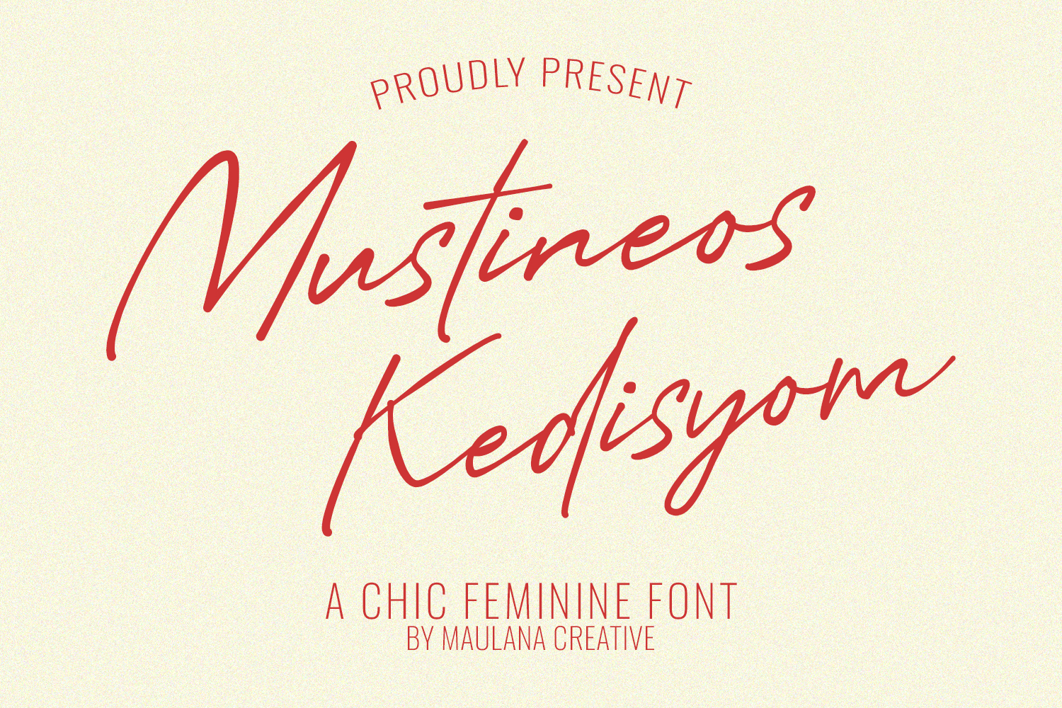 Introducing Mustineos Kedisyom a stunning, chic feminine script font designed to add an elegant and sophisticated touch to any project.