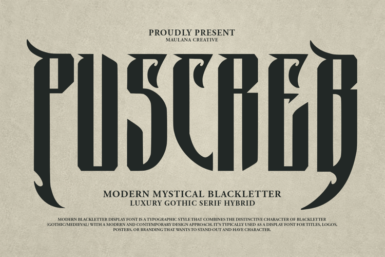 Puscreb is a sophisticated display font designed by Maulana Creative that masterfully blends the heritage of traditional Blackletter with the sleek refinement of a modern luxury serif. It is crafted for designers looking to balance "mystical" or "gothic" vibes with contemporary, high-end aesthetics.
