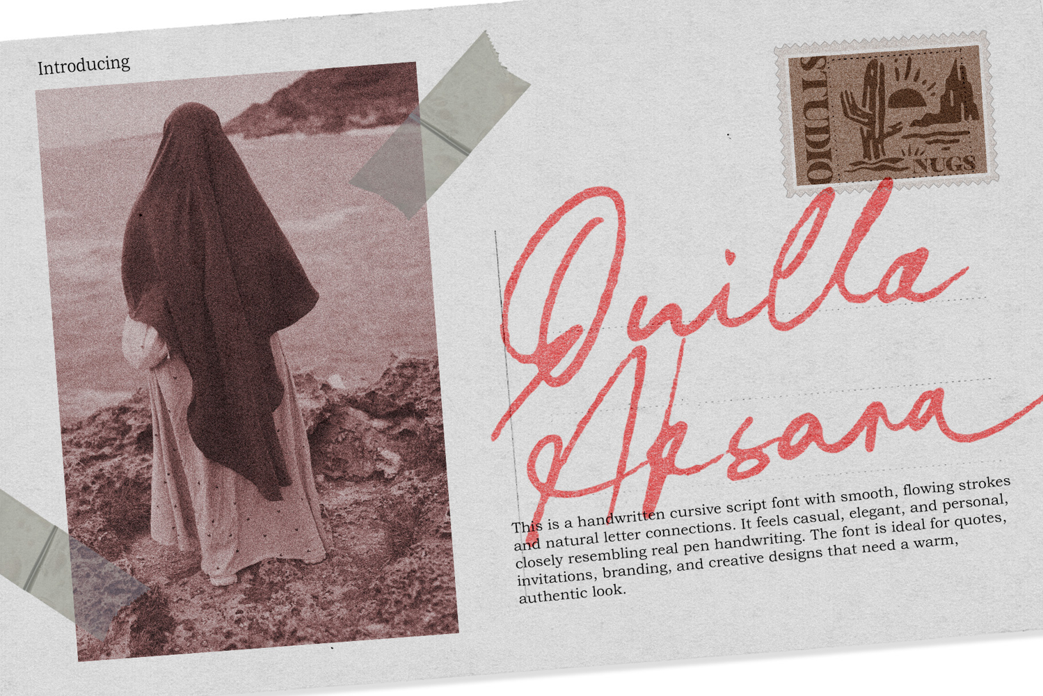 Hello! Let me introduce Quilla Aksara — a modern calligraphy font. With its natural, elegant shapes Walonka is the perfect choice for logos, branding, web, blog headlines, invitations, magazine and book design, product packaging — or for any text on postcards and on your favorite photos.