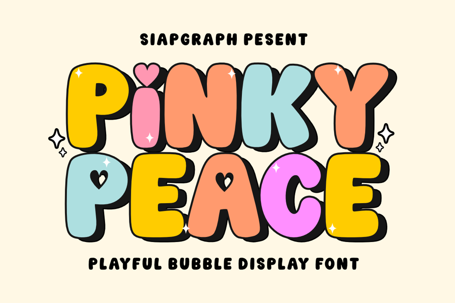 Bring your ideas to life with Pinky Peace, a charming and playful bubble display font that exudes playfulness! Its soft curves and bold appearance are perfect for creating eye-catching headlines, posters, social media graphics, and branding. Add a dreamy touch to your designs with this delightful font that’s both fun and versatile.