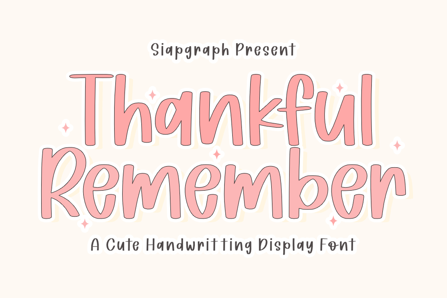 Bring your ideas to life with Thankful Remember, a charming and cute handwriting display font that exudes playfulness! Its soft curves and bold appearance are perfect for creating eye-catching headlines, posters, social media graphics, and branding. Add a dreamy touch to your designs with this delightful font that’s both fun and versatile.