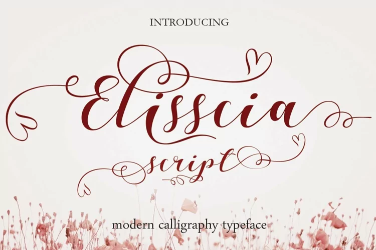 Elisscia Script : a very beautiful script typeface Modern, Romantic and equipped wi fine lines to enhance the look is perfect for various purposes. Like titles, signatures, logos, correspondence, wedding invitations, letterheads, nameplate, labels, bulletins, posters, badges, Branding, Greeting Cards, etc.
