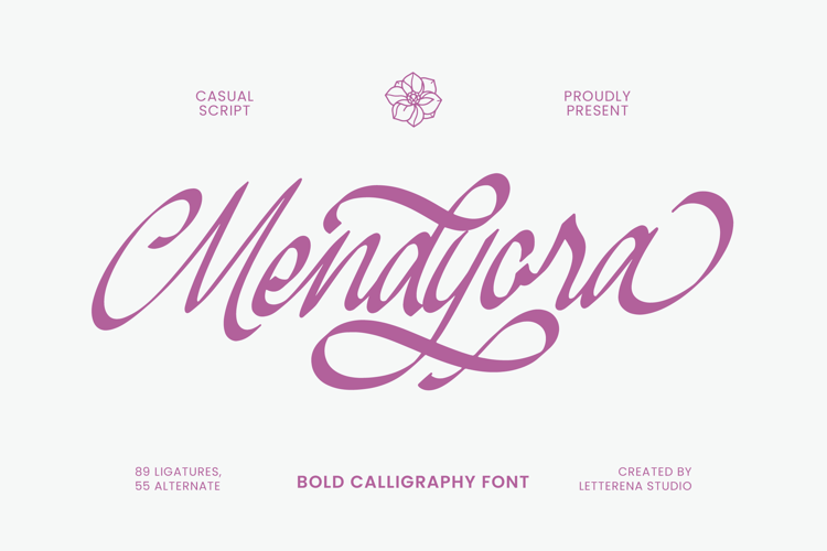 Mendyora - Bold Calligraphy Font , from Letterena, is a Luxury Script font, suitable for any projects such as: logos, branding projects, homeware designs, product packaging, mugs, quotes, posters, shopping bags, t-shirts, book covers, name card, invitation cards, greeting cards, label, photography, watermark, special events, and all your other luxury and beautiful projects that need a Luxury Script taste.