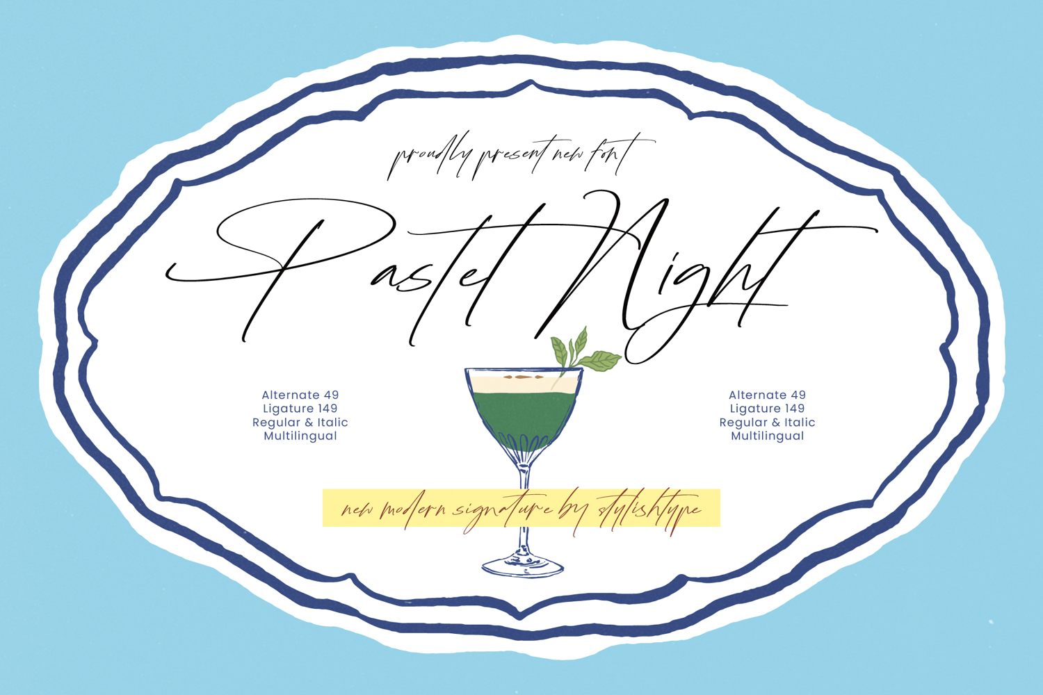 Pastel Night is a modern signature typeface with ultra-elegant strokes and a naturally flowing handwritten rhythm, designed for refined branding, editorial aesthetics, boutique packaging, invitations, and lifestyle visuals that demand a soft, sophisticated personality. With 149 ligatures, 49 alternates, and both regular & italic styles, this font offers complete creative flexibility for crafting expressive logos, identities, beauty campaigns, social media posts, and premium product designs. Its thin, graceful lines bring a luxurious sense of intimacy and effortless charm, making every composition feel intentional, stylish, and beautifully minimal.