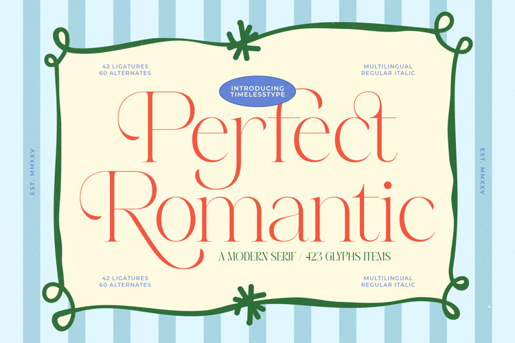 Perfect Romantic - Modern Serif. This typeface is a masterclass in balance, merging the classic precision of a modern serif with a distinctively romantic and whimsical undertone. Its characters feature exaggerated high-contrast strokes and delicate terminals that instantly command attention, delivering an aesthetic that is both sophisticated and invitingly playful. It is meticulously designed specifically for maximizing visual impact in display settings and high-profile creative projects.