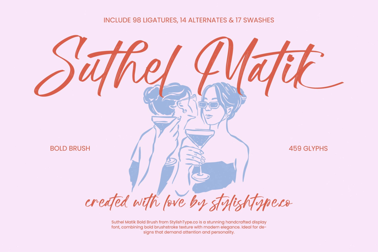 Unlock unparalleled typographic creativity using its comprehensive suite of OpenType features. With over 450 glyphs, 98 sophisticated ligatures, 14 stylistic alternates, and 17 dramatic swashes, Suthel Matik - Bold Brush Font provides the tools needed for truly bespoke lettering. Designers can effortlessly customize every headline and logotype, ensuring that each piece of copy feels uniquely hand-drawn and maintains a seamless, natural flow.