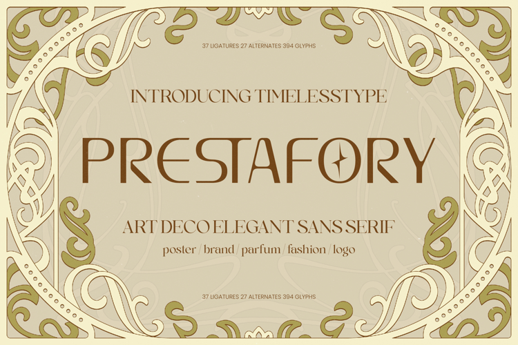 Prestafory is an elegant Art Deco–inspired sans serif typeface designed to deliver timeless sophistication with a refined architectural structure. Featuring 37 ligatures, 27 alternates, and 394 glyphs, this display font combines geometric precision with graceful decorative influence, creating a perfect balance between vintage glamour and modern luxury branding. Its clean yet expressive letterforms make it ideal for premium logos, fashion identities, perfume packaging, editorial headlines, posters, and high-end brand presentations. Prestafory brings a distinctive Art Deco elegance that elevates typography into a statement of class, prestige, and visual authority.