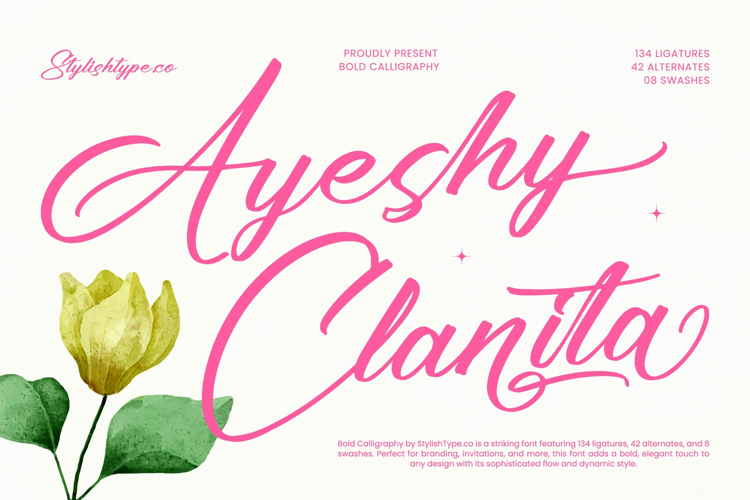 Ayeshy Clanita is a bold calligraphy script font designed to deliver elegance, confidence, and expressive movement in every letterform. With flowing strokes, refined curves, and dynamic swashes, this typeface captures the beauty of handcrafted lettering while maintaining a polished modern finish. Perfect for branding, wedding invitations, luxury packaging, beauty labels, social media graphics, and high-end logos, Ayeshy Clanita adds a sophisticated and feminine touch to any project. Featuring 134 ligatures, 42 alternates, and 8 swashes, it offers extensive stylistic flexibility for seamless connections and graceful compositions. Whether used for romantic headlines or stylish signatures, Ayeshy Clarita brings bold elegance and timeless calligraphic charm to both print and digital design.
