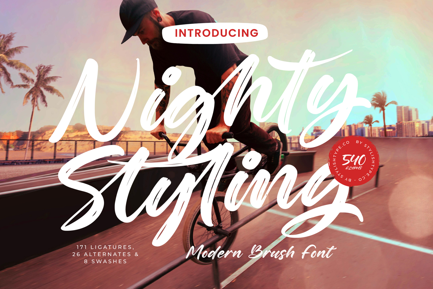 Nighty Styling is a modern brush font that captures energy, boldness, and contemporary street style. With expressive brush strokes, dynamic ligatures, and authentic handwritten texture, this typeface is perfect for projects that demand impact, creativity, and a modern edge. Featuring 171 ligatures, 26 alternates, and 8 swashes, Nighty Styling provides designers with endless options to create bold, customized lettering compositions.