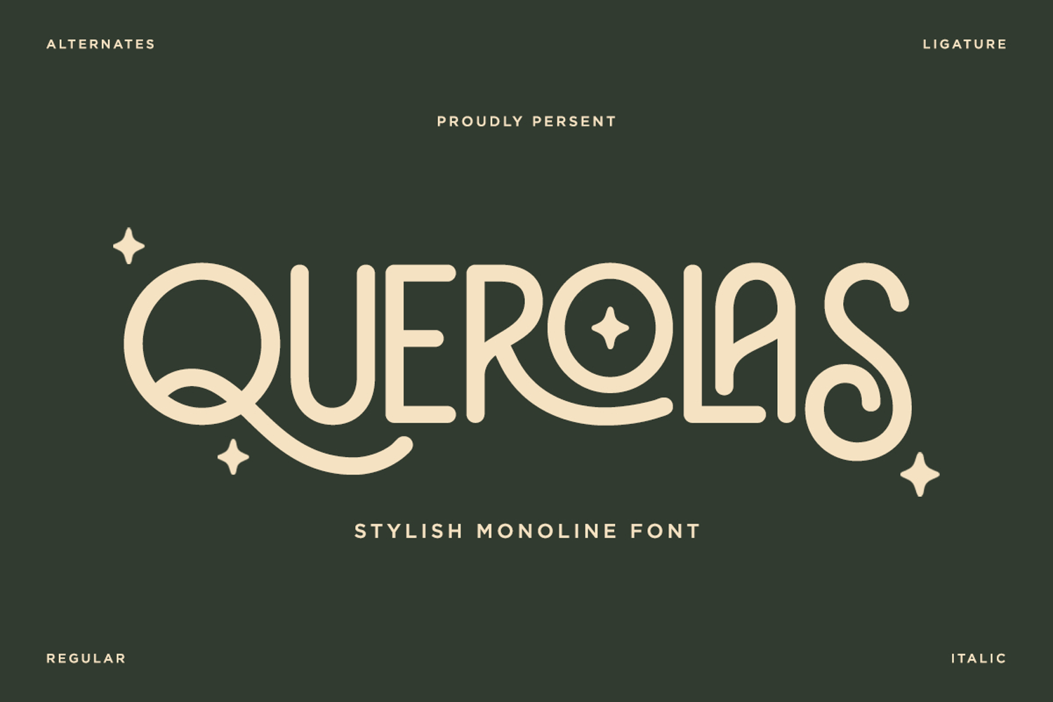 Meet Querolas, a playful yet elegant monoline design that brings a touch of retro charm and modern style to any project. Its smooth curves, balanced lines, and decorative alternates make it perfect for creating standout visuals with personality. Querolas is designed to be both fun and versatile — perfect for projects that need a creative, eye-catching touch. Perfect for Branding & Logo Design, Retro Posters & Signage, Product Packaging, Social Media Content, Wedding Invitations, Apparel & Merch Design, Quotes & Headlinesfor