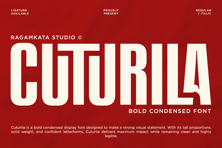 Perfect for branding, posters, logos, packaging, editorials, and advertising, Cuturila is built for designers who want their message to feel strong, direct, and memorable. Whether used in print or digital projects, this font delivers a bold statement with refined precision.